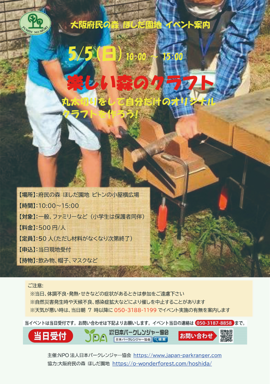 2024.04.20 【開催終了】楽しい森のクラフト 過去のイベント ほしだの森 5/5こどもの日の特別イベント! パークレンジャー指導のもと、のこぎりを使って丸太切りに挑戦してみよう! 自分で切った丸太や自然の素材を使ったぶんぶんコマ・エンピツ作りを体験できます ※当日現地で受付です。ピトンの小屋周辺イベント会場までおこしください。 FOLLOW US 記事一覧