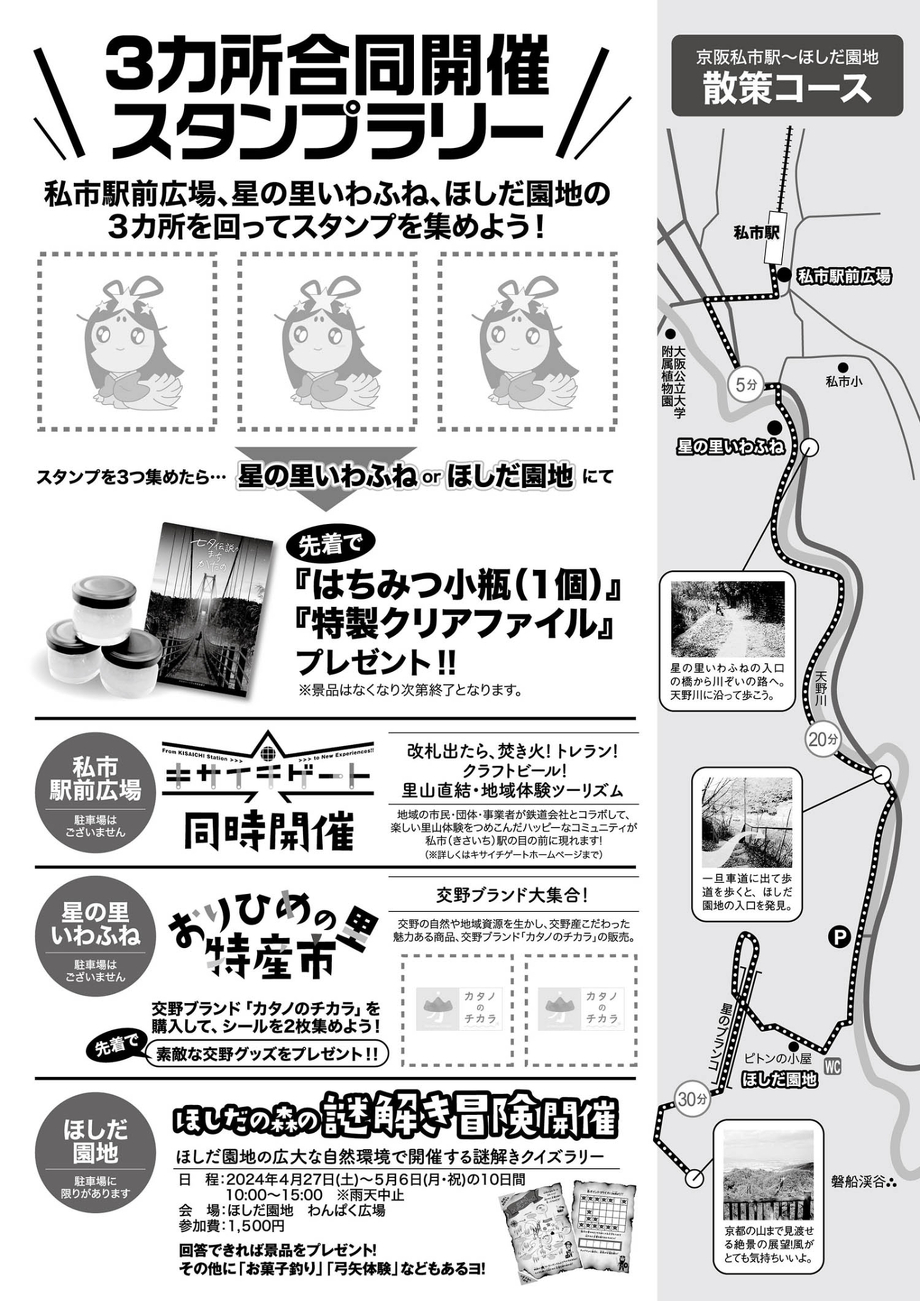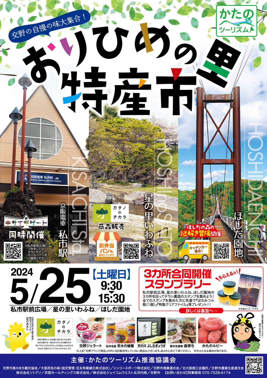 2024.05.07 【開催終了】おりひめの里 特産市 過去のイベント ほしだの森 5/25(土)、おりひめの里 特産市が開催されます。 星のブランコでワクワクドキドキしたあとは、交野の味を楽しもう! GWに開催し大好評だった『謎解きイベント』も当日開催致します!! 詳細はこちらから FOLLOW US 記事一覧