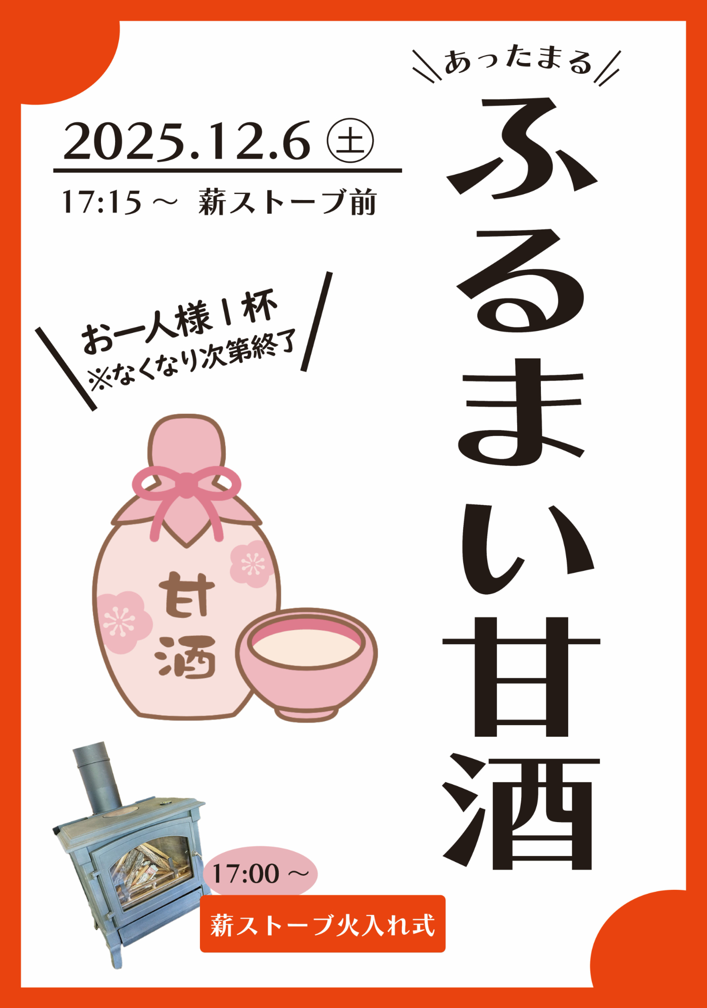 2025.12.05 【ほしだの森】薪ストーブ火入式&ふるまい甘酒 過去のイベント ほしだの森 12/6(土)17:00~ ほしだ園地ピトンの小屋に今季新たに設置された薪ストーブの火入式を行います。 火入式のあとは薪ストーブ前で甘酒のふるまいを行います!(先着100名さま限定) ※甘酒はノンアルコールです 12月6日(土) 17:00~ 薪ストーブ火入式 17:15~ 甘酒ふるまい(先着100名様限定) 薪ストーブの優しい暖かさと炎の揺らぎに癒されながら、 甘酒でほっと一息つきませんか? FOLLOW US 記事一覧