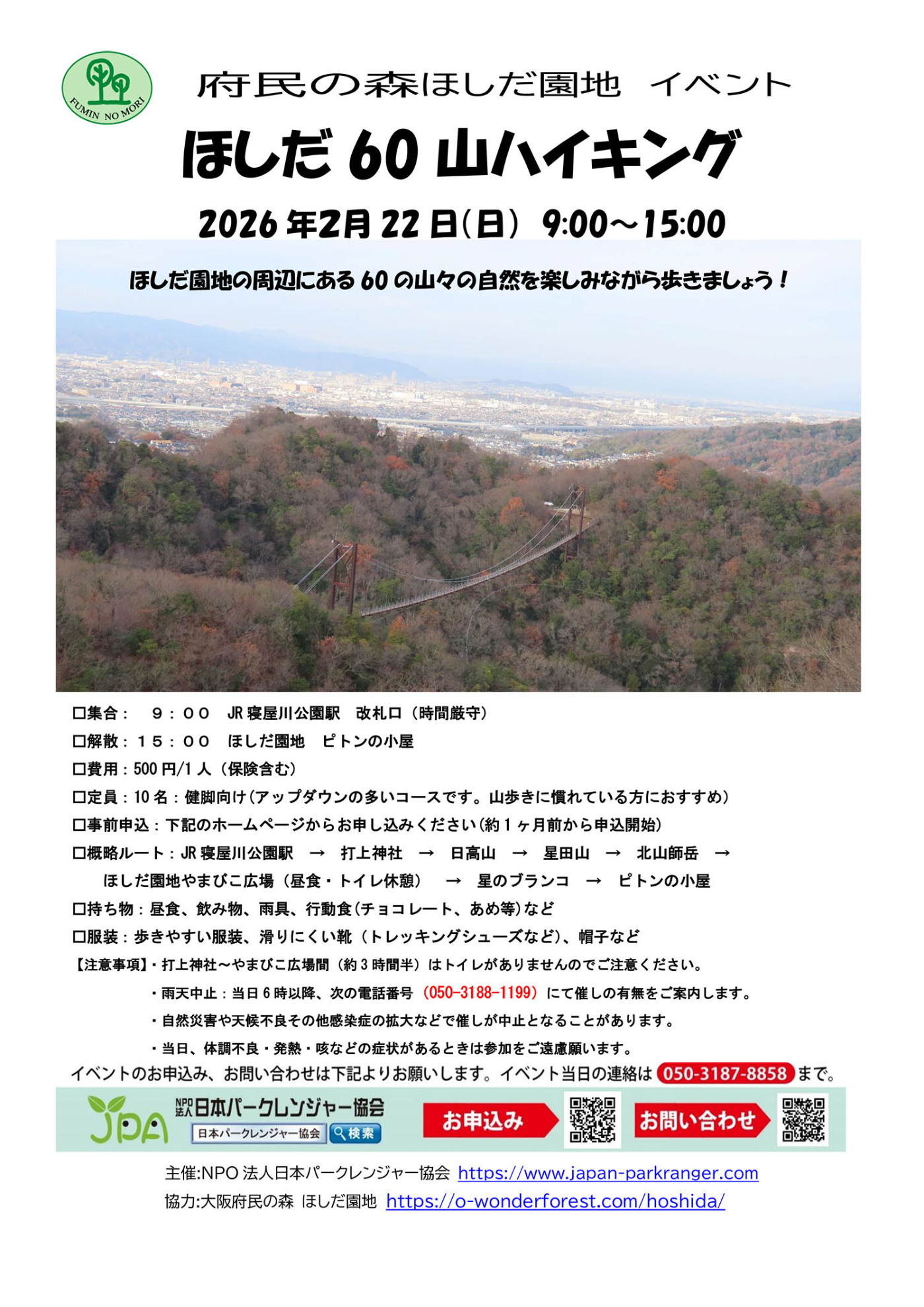 2/22(日)パークレンジャー協会主催『ほしだ60山ハイキング』がおこなわれます。
