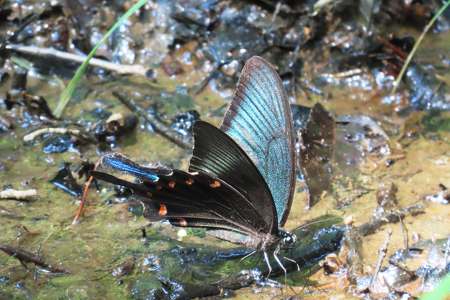 2023.07.28 カラスアゲハ 生き物さんさく くろんどの森 2023/07/28撮影 翅を広げると8cmほどもある大型の蝶。年に2,3度発生しますが春よりも夏の方がより大型になります。 クロアゲハに似ていますがカラスアゲハは翅の内側が青緑色に輝く鱗粉が特徴。華やかな印象を与える後翅の尾状突起もクロアゲハにはない特徴です。 日中は基本的に高いところを飛んでいますが時々吸水のため地面に降りてきます。 八ツ橋などの水辺を狙って観察してください。 FOLLOW US 記事一覧