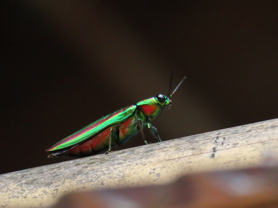 2022.09.04 ヤマトタマムシ 生き物さんさく くろんどの森 2022/08/06撮影 緑と赤のメタリックな光沢は、タマムシの天敵である鳥から身を守るための手段です。鳥は色の変わるものを怖がる性質があり、見る角度によって色の変わるこの光沢は鳥にとっては不気味なものなのかもしれません。 6~9月頃の日中日差しの強い時間にエノキやケヤキなどの広葉樹に集まります。 くろんど園地では炊事棟の辺りでよく見かけます。見つからないときは高い樹のてっぺん辺りを見上げてください。たくさん飛び交っている姿が見られますよ。 FOLLOW US 記事一覧