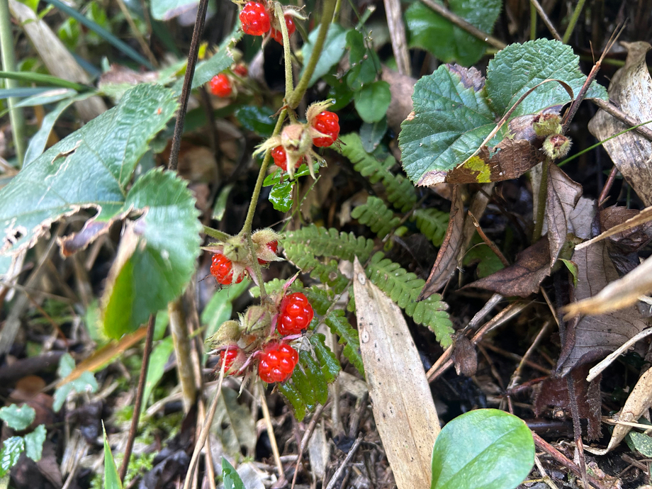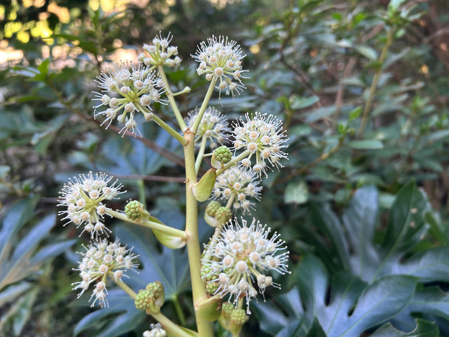2024.11.04 ヤツデ・フユイチゴ 秋が深まり、朝晩寒くなりましたね 園内では、フユイチゴの実が目立つようになりました ヤツデの花も咲き始めました(^^) 花の後は緑の実になり、次第に黒くなりますよ