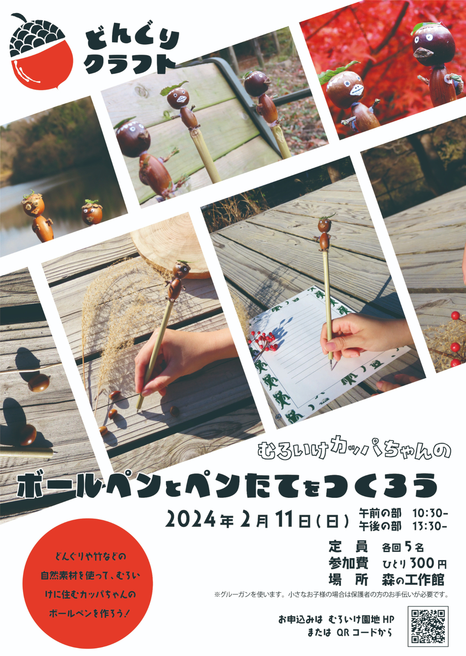 2024.01.06 【開催終了】どんぐりクラフト むろいけカッパちゃんのボールペン 過去のイベント むろいけの森 【開催終了】 冬の森の宝物どんぐりを使ってどんぐりクラフトに挑戦しよう! 日時:2月11日(日) 午前の部10:30~ 午後の部13:30~ 定員:各回5名 場所:森の工作館 参加費:300円 服装:グルーを使います。汚れてもよい服装でお願いします。 申し込みは下記申込サイトから(1/11 9:00より申し込み開始) ■午前の部:10:30~ ■午後の部:13:30~ FOLLOW US 記事一覧
