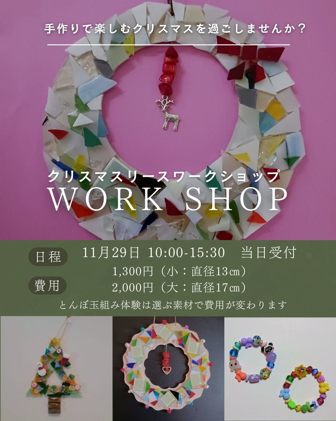 内容:木のリース、木のクリスマスツリーから1つを選び、ステンドグラスの色ガラスや、タイルを木工ボンドで貼ってクリスマスリースを作ります。