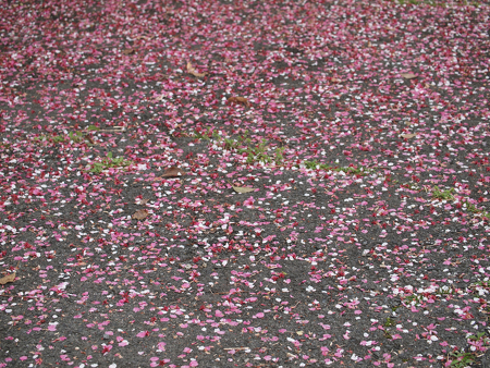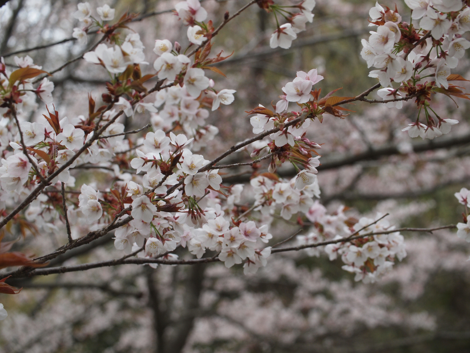 葉が多くなって来ている桜もあれば、まだ蕾を付けている桜もあり、もう少しの間花を楽しませてくれそうな気配です。散った花びらも、地面をピンクに飾ってくれていて、こちらも楽しめます^^