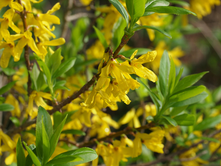 見晴らし休憩所では、リキュウバイ(写真左)が満開に、らくらくセンターハウス前では現在レンギョウ(写真右)が綺麗に咲いております。
