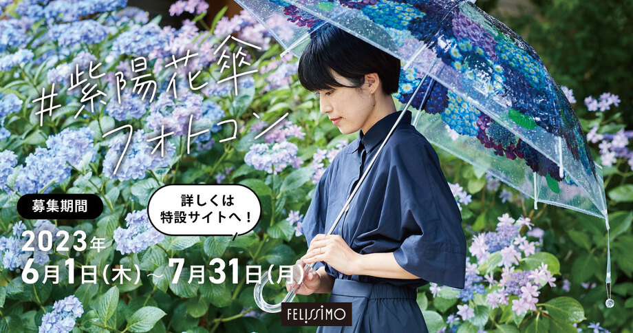 「雨空に咲きこぼれる 紫陽花の傘」が映った写真を、#紫陽花傘フォトコン を付けてSNSに投稿することで、簡単にフェリシモさんのフォトコンテストに参加できますよ。