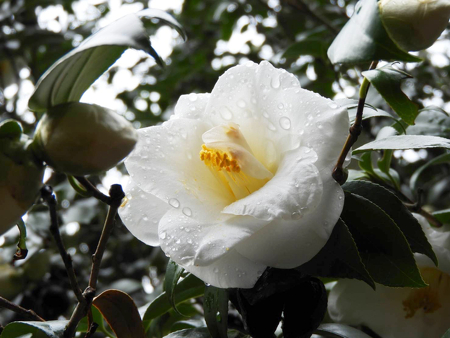 他の種類のツバキも綺麗に咲いています。水滴が乗った花の様子も綺麗です。