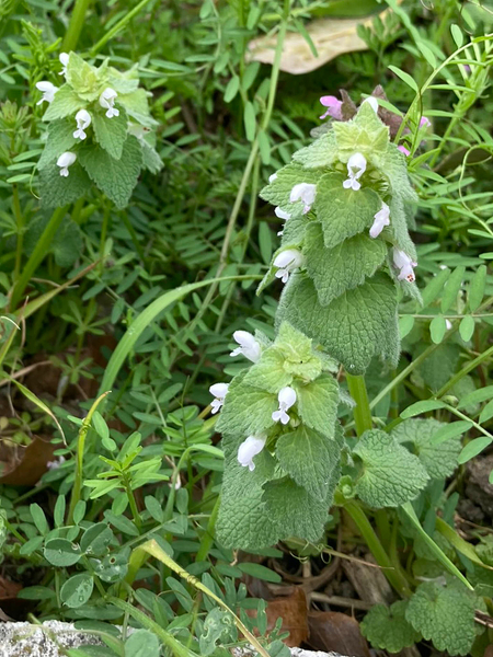 駐車場の雑草にも、是非皆さん注目してみてください。ヒメオドリコソウと言えばピンクだと思うのですが、なるかわ園地では白花のヒメオドリコソウも咲いているんですよ。葉の色も違っていたりしますので探してみて下さい。