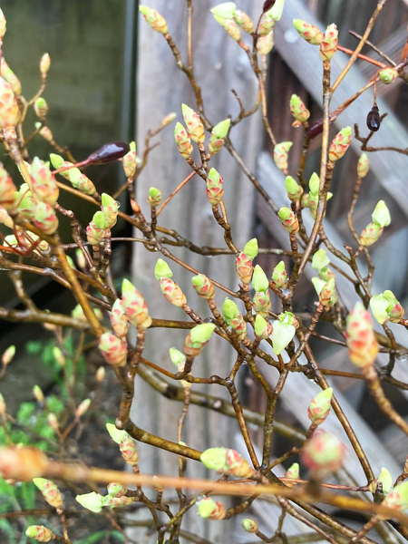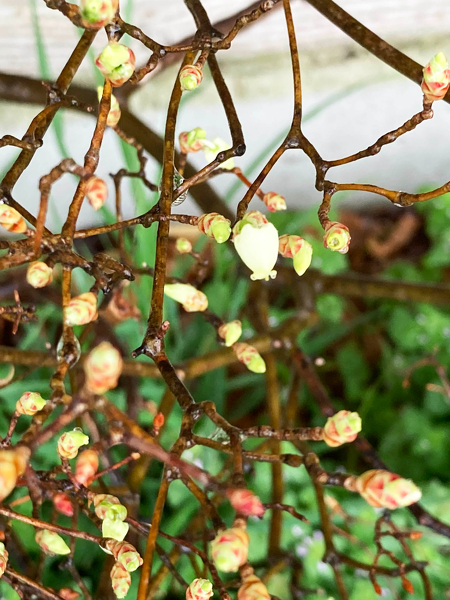 向かいのトイレ横では、ドウダンツツジの花芽が膨らみ、少しですが咲いているものも見受けられます。秋には紅葉で楽しませてくれていたドウダンツツジ。この後白花を続々と咲かせ楽しませてくれそうです。