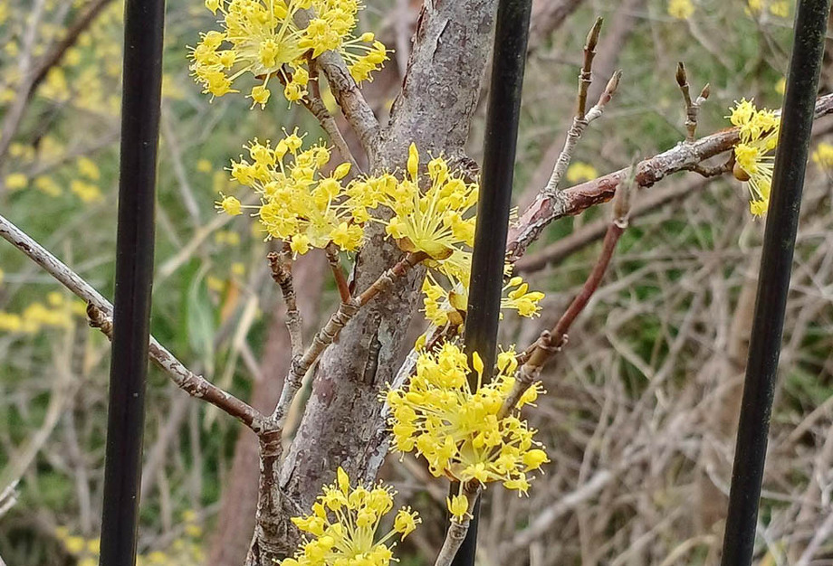 こちらがサンシュユ、ミズキ科の落葉小高木。秋にはグミに似た赤い実を付けます。別名でハルコガネバナ、アキサンゴ、ヤマグミとも呼ばれています。