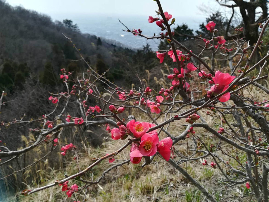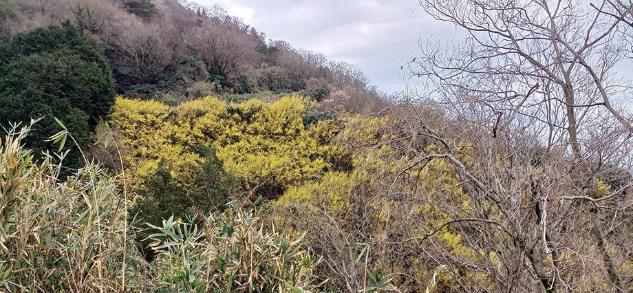 同日3/13,くさか園地では山茱萸(サンシュユ)が綺麗に咲いていたようです。山肌が黄色くなっていて、何が咲いてるんだろうと気になりますね。奥に見えているピンク色はサクラなのでしょうか。