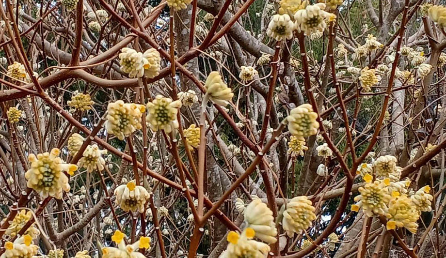 3/13、なるかわ園地ぼくらの広場のミツマタです。ジンチョウゲ科の低木で、コウゾやガンピのように和紙の原料として利用されたりしています。少し変わった趣のミツマタの花。是非見に来て下さい。