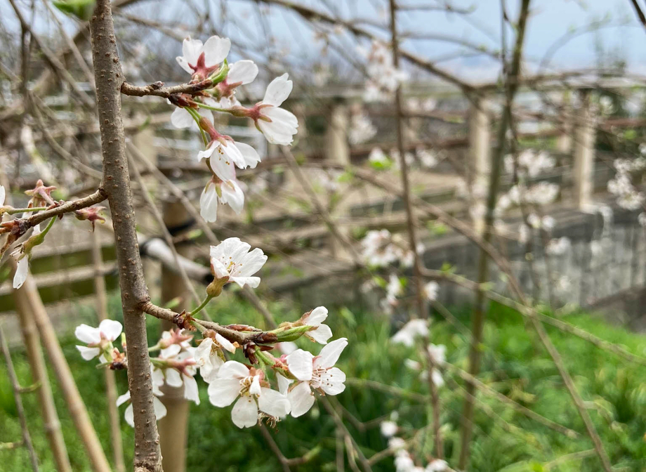 最後になりましたが、時折開花状況のお問い合わせをいただくこともあるぼくらの広場のサクラの本日(3/31)の写真です。眺望と一緒に桜も楽しめるのは最高ですね。