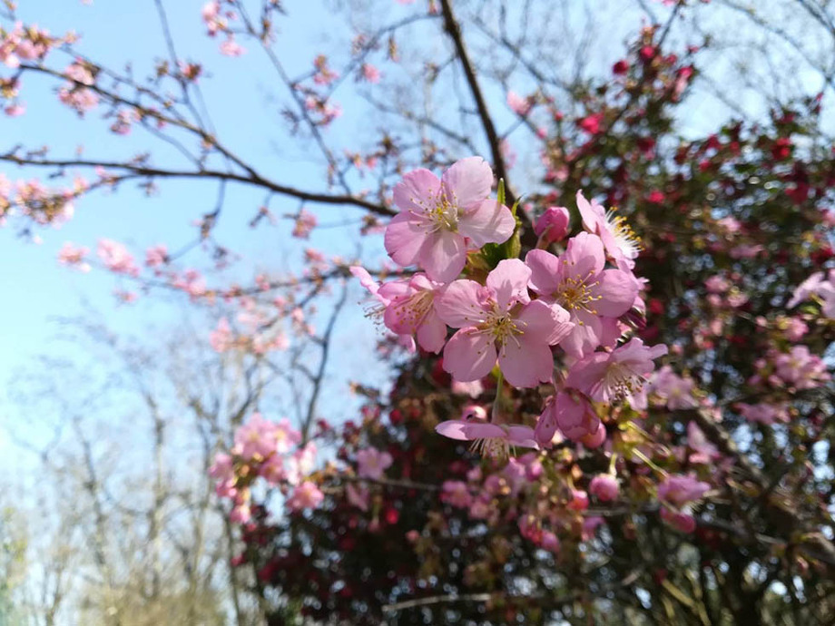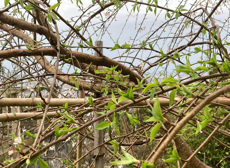 らくらくセンターハウス横のベニシダレ。小ぶりの可愛らしい花を咲かせて楽しませてくれています。つけていたほぼ全ての蕾が開花し、元気な葉が目立つようになってきました。