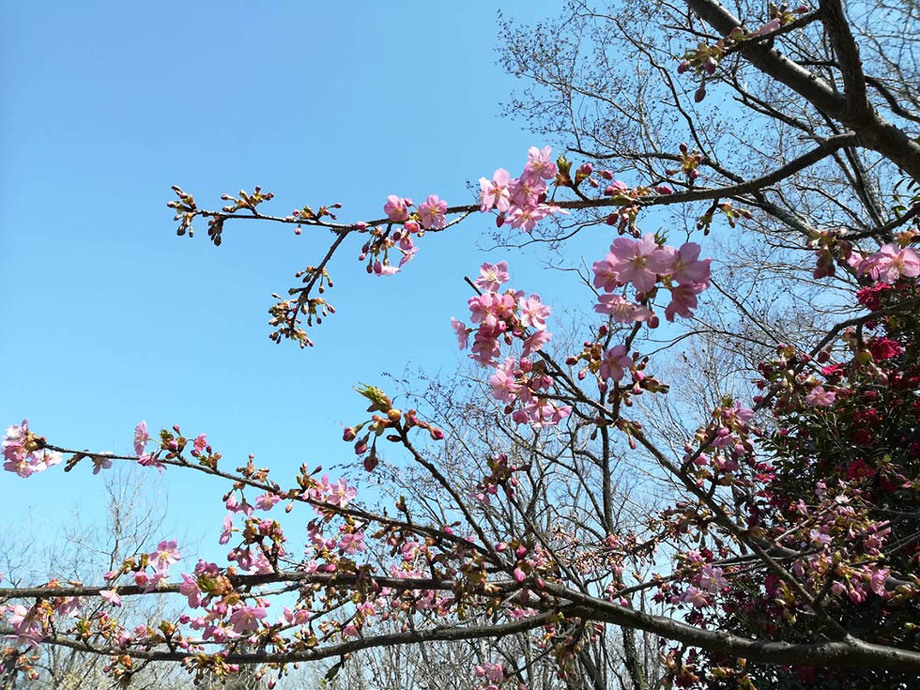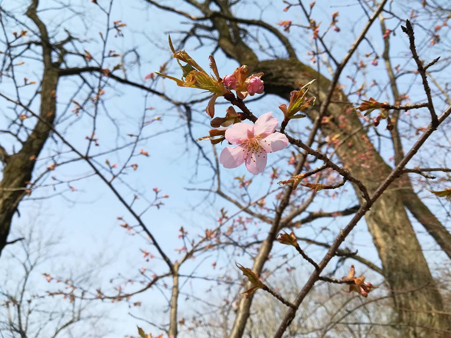 くさか園地、こぶしの谷付近の様子を園地職員が写真に撮ってきてくれました。撮影日は3月8日です。灯篭ゲート付近では綺麗にカワヅサクラが開花しているようです。