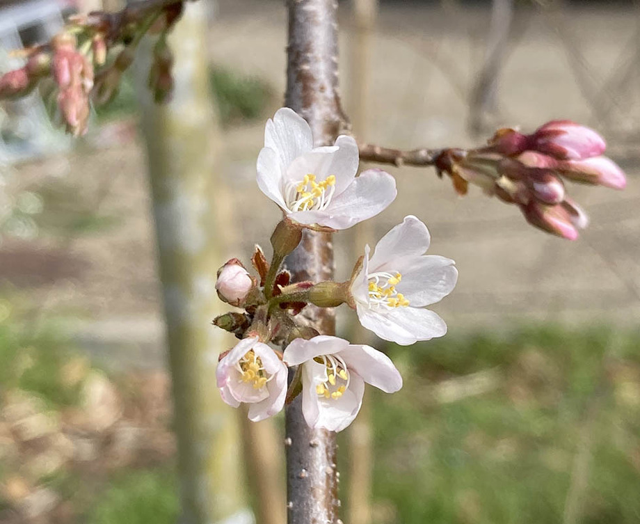 こちらユキヤナギの隣にいるベニシダレ。福島県にある天然記念物の三春滝桜の種子から福島県三春町立中郷小学校の生徒さんが育てた苗木が成長したものです。昨日3/16(木)、ついに開花しました!!まだまだ沢山蕾をつけています。