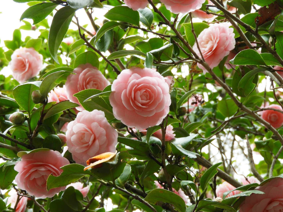 辻子谷近くではツバキが綺麗に開花しているようです。乙女椿がこんなに沢山の花を付けてくれています。個人的に大好きな花。ピンク色の八重咲がとても綺麗です。雄しべが見えないのも特徴ですね。