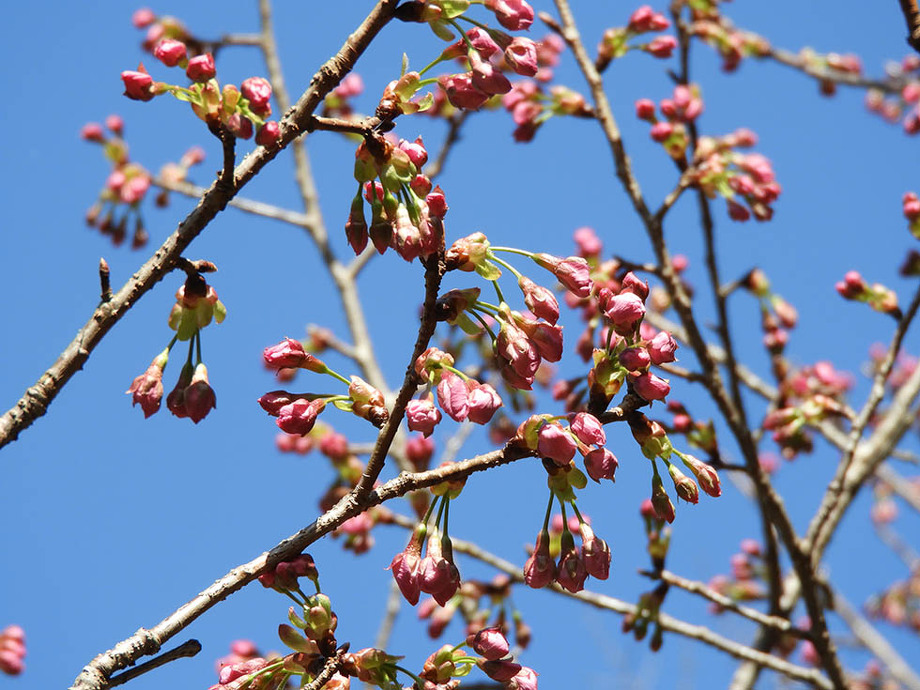 くさか園地、灯篭ゲート付近では綺麗にカワヅサクラの開花が随分進んでいるようで、3/12に園地職員が写真を撮って来てくれました。先週の金曜日に更新した3/8の写真と比べると、蕾も随分大きくなっています。お天気が良かったせいもあり、とってもきれいですね。