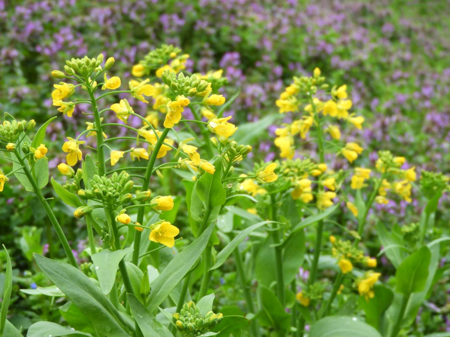 春が来たなと思わせてくれるアブラナ。菜の花とも呼ばれています。菜の花とはアブラナ属の総称のようです。奥に見えるのピンク色はヒメオドリコソウでしょうか、ホトケノザでしょうか。