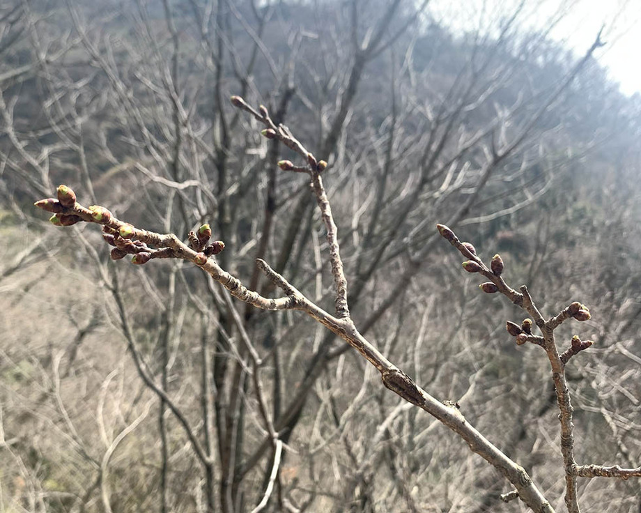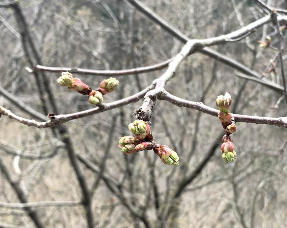 昨日のらくらく登山道沿いのサクラの様子です。花芽も膨らみ、緑色が覗いているのが分かりますでしょうか。この春も楽しませてくれると思うと、とっても楽しみです。