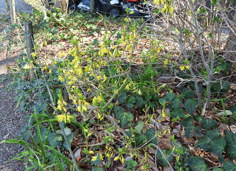 らくらくセンターハウス前の公衆電話の横にあるケヤキの大木の足元では、レンギョウの花が綺麗に咲いています。モクセイ科の落葉低木。株元からはベーサルシュートも出て元気いっぱいな様子。