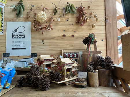 パークレンジャーさんのリースをらくらくセンターハウスのレジ周り飾っております。とても素敵なので、是非ごらんください。売店らくらくにも松ぼっくりなどを飾り、ちょっぴりクリスマスっぽくなりました。