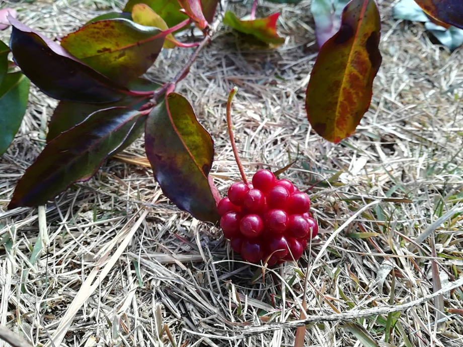 まずはサネカズラ、別名ビナンカズラ(写真は12/9撮影)。とても綺麗な赤い実を付けるつる性の植物です。写真はぼくらの広場で撮影されたものですが、らくらく登山道でも(少し離れたところですが)見ることができます。