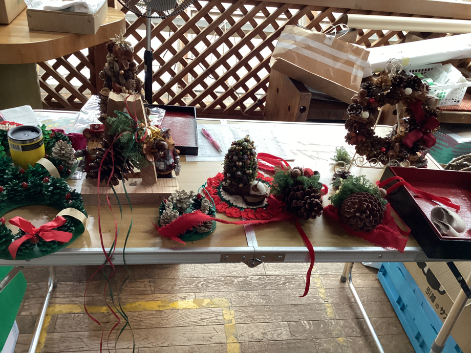 らくらくセンターハウスでは今『なるかわビッグツリー』を展示中です。大きなツリーのある空間でのリース作り、楽しんでいただけましたでしょうか。