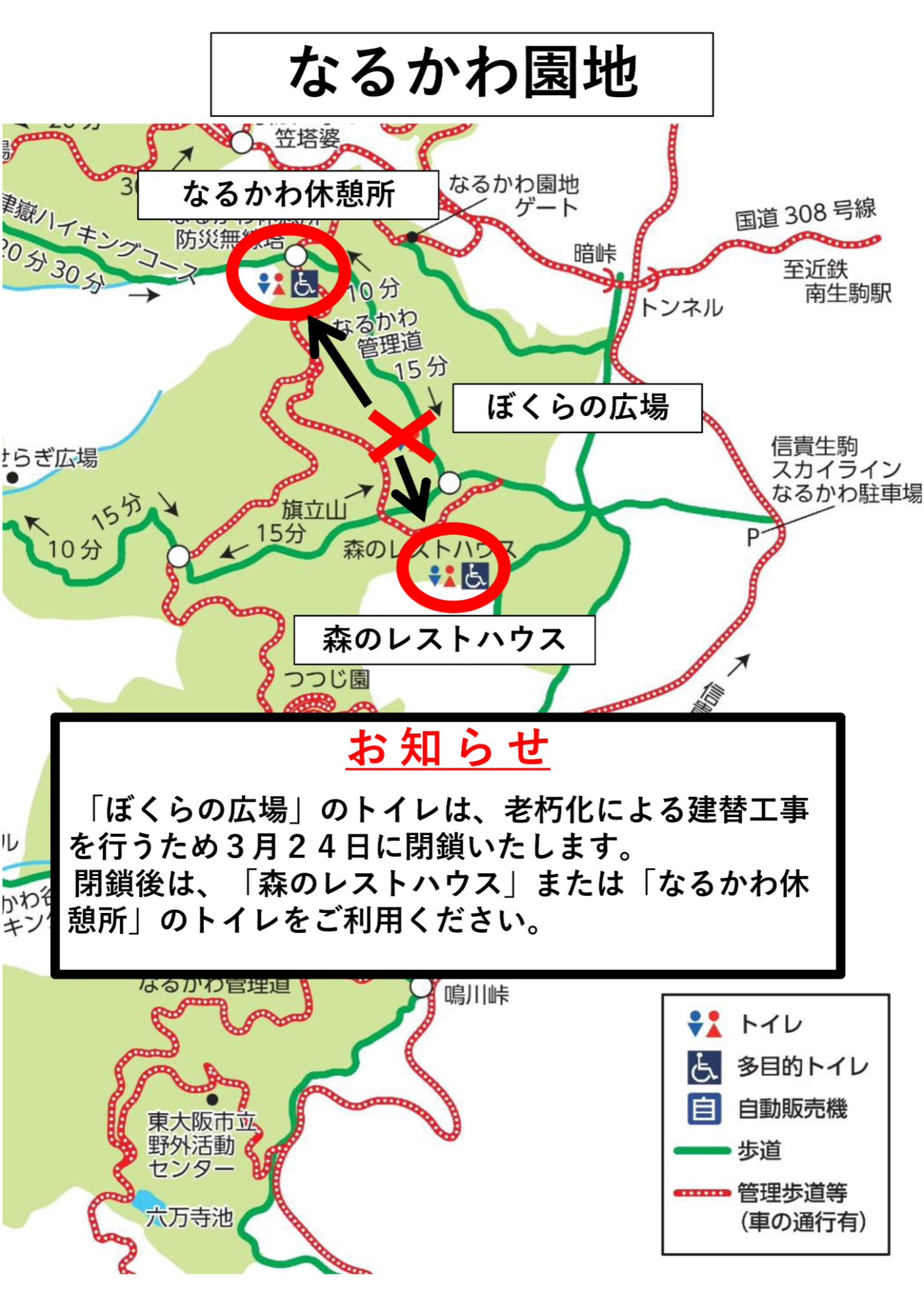 閉鎖中は、「森のレストハウス」または「なるかわ休憩所」のトイレをご利用ください。