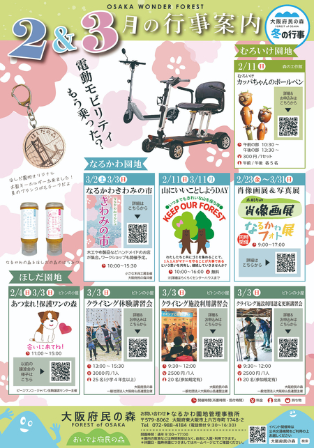2024.01.22 【大阪府民の森】2月&3月のイベント案内 イベント情報 大阪府民の森で2月&3月に開催するイベントのご案内 【ほしだ園地】 2/4(日)11:00~15:00 あつまれ!保護ワンの森 保護犬譲渡会詳細はこちら 3/3(日)11:00~15:00 あつまれ!保護ワンの森 保護犬譲渡会詳細はこちら 3/3(日)13:00~15:30 クライミング体験講習会 詳細はこちら 3/3(日)9:30~12:00 クライミング施設利用講習会 詳細はこちら 3/3(日) 9:30~12:00 クライミング施設利用認定更新講習会 詳細はこちら ※ほしだ園地・2月のキッチンカー出店予定はこちらから →→ ☆ 【むろいけ園地】 2/11(日)①10:30~②13:30~ むろいけカッパちゃんのボールペン 詳細はこちら 【なるかわ園地】 2/11(日)10:00~16:00 山にいいことしようDAY 詳細はこちら 2/23(金)~3/31(日)9:00~17:00 木彫りの肖像画展 詳細はこちら 2/23(金)~3/31(日)9:00~17:00 なるかわフォト展 詳細はこちら 3/2(土)3/3(日)10:00~15:30 なるかわきわみの市 詳細はこちら 3/11(月)10:00~16:00 山にいいことしようDAY 詳細はこちら FOLLOW US 記事一覧