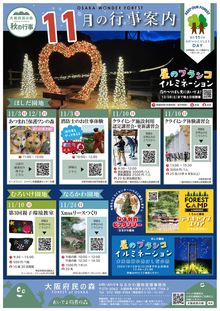 2024.10.23 【大阪府民の森】11月のイベント案内 イベント情報 大阪府民の森で11月に開催するイベントのご案内 【ほしだ園地】 11/3(日)11:00~15:00 あつまれ!保護ワンの森 保護犬譲渡会 前回の様子はこちら 11/3(日)10:00~12:00 消防士のお仕事体験 詳細はこちら 11/10(日)9:30~12:00 クライミング施設利用講習会更新講習会 詳細はこちら 11/10(日)13:00~ 15:30 クライミング体験講習会 詳細はこちら ほしだ園地・11月のキッチンカー出店予定はこちらから →→ ☆ 【むろいけ園地】 11/10(日)10:30~14:00 第3回親子環境教室 詳細はこちら 【なるかわ園地】 11/1(金) なるかわビッグツリー 昨年の様子はこちら 11/24(日) Xmasリースつくり 詳細はこちら FOLLOW US 記事一覧