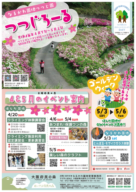 2025.03.22 【大阪府民の森】4&5月のイベント案内 イベント情報 大阪府民の森で4&5月に開催するイベントのご案内 【ほしだ園地】 4/6(日)11:00~15:00 あつまれ!保護ワンの森 保護犬譲渡会 前回の様子はこちら 4/20(日) 9:30~12:00 クライミング施設利用講習会 更新講習会 詳細はこちら 4/20(日) ①13:00~14:00②14:30~15:30 クライミング体験講習会 詳細はこちら 5/4(日) 11:00~15:00 あつまれ!保護ワンの森 保護犬譲渡会前回の様子はこちら 5/5(月祝) 10:00~14:30 楽しい森のクラフト coming soon ほしだ園地・4月のキッチンカー出店予定はこちらから →→ ☆ 【なるかわ園地】 5/3(土) とんぼ玉・モザイクガラス体験 詳細はこちら FOLLOW US 記事一覧