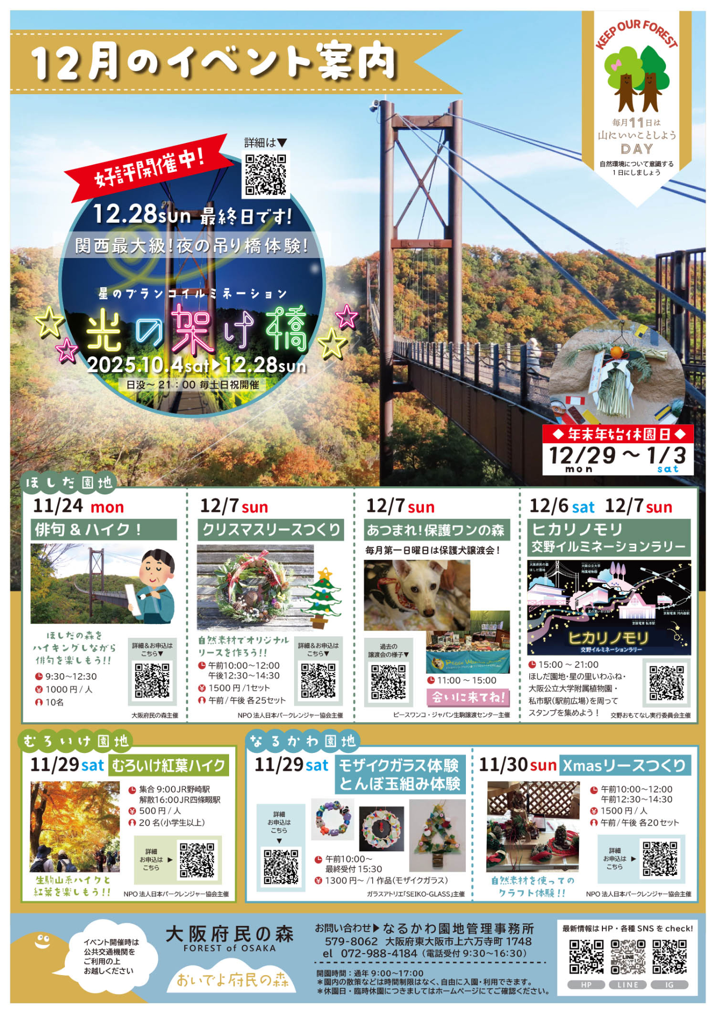 2025.11.15 【大阪府民の森】12月のイベント案内 イベント情報 大阪府民の森で11月後半~12月に開催するイベントのご案内 【ほしだ園地】 11/24(月祝) 9:30~12:30 俳句&ハイク! 詳細はこちら 12/7(日)11:00~15:00 あつまれ! 保護ワンの森 保護犬譲渡会 前回の様子 12/7(日)午前/10:00~12:00午後/12:30~14:30 クリスマスリースつくり 詳細はこちら 12/6(土)12/7(日)15:30~21:00 ヒカリノモリ交野イルミネーションラリー 詳細はこちら 星のブランコイルミネーション『光の架け橋』は2025年12月28日(日)までの毎土日祝に開催中です! 詳細はこちら →→ ☆ ほしだ園地・キッチンカー出店予定はこちらから →→ ☆ 【なるかわ園地】 11/29(土)10:00~15:00 モザイクガラス体験とんぼ玉組体験 詳細はこちら 11/30(日)午前/10:00~12:00 午後/12:30~14:30 Xmasリースつくり 詳細はこちら 11/1~12/25までらくらくセンターハウスになるかわビッグツリーを展示中! 詳細はこちら →→ ☆ 【むろいけ園地】 11/29(土)集合9:00解散16:00 むろいけ紅葉ハイク 詳細はこちら FOLLOW US 記事一覧