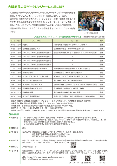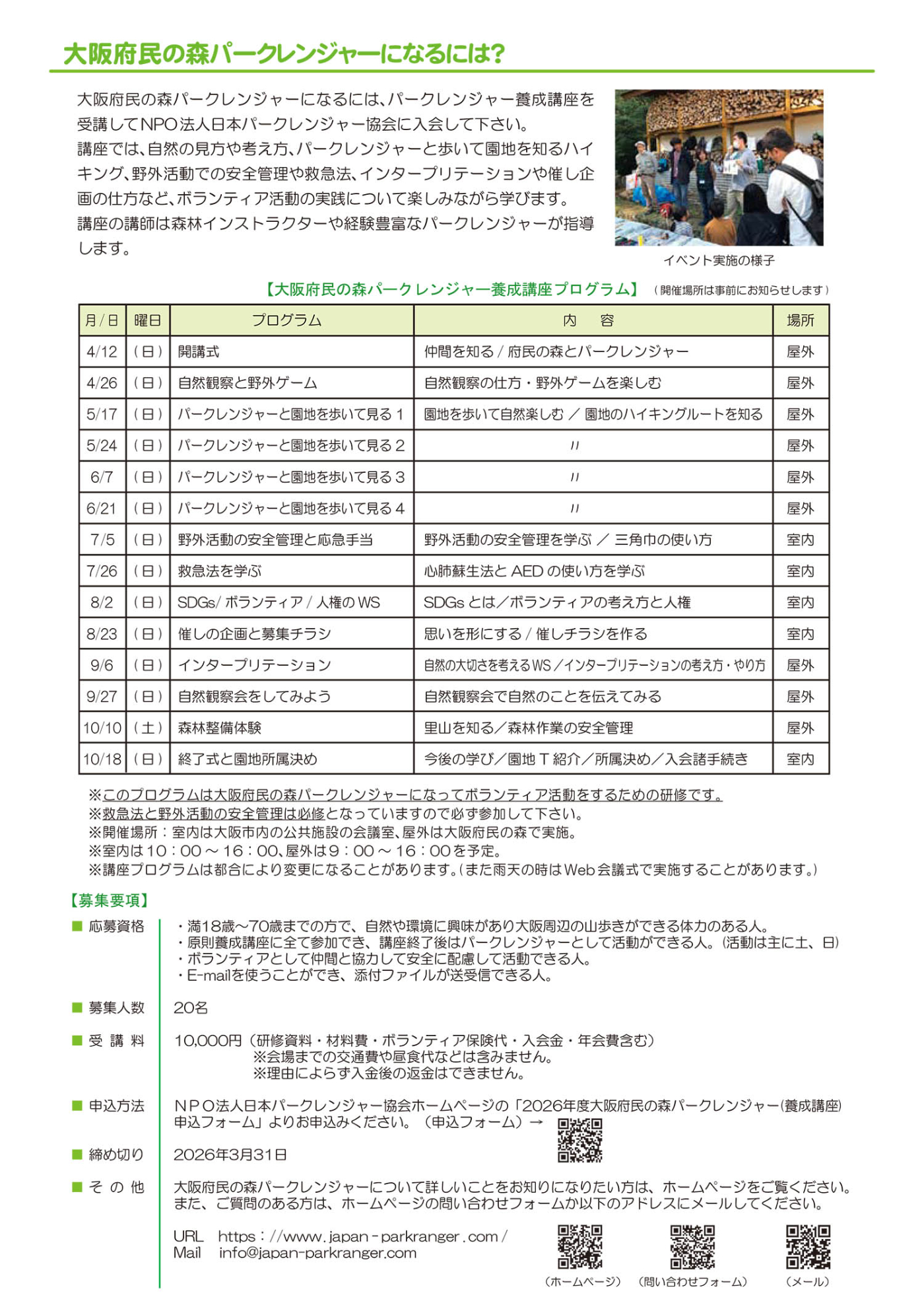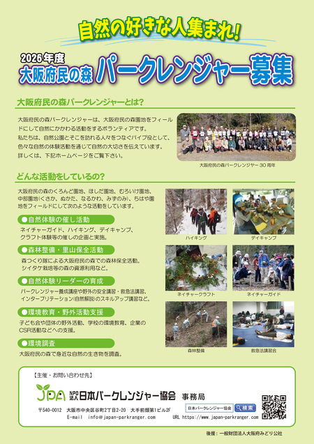 2026.01.06 【大阪府民の森】NPO法人日本パークレンジャー協会 イベント情報 NPO法人日本パークレンジャー協会では 2026年度 大阪府民の森パークレンジャー募集しています! パークレンジャーは府民の森で活動する自然のボランティアです。 自然ガイドや、ハイキング・野外料理・自然素材のクラフトなどのイベントの実施、 またパークレンジャーの養成、森林整備、環境調査活動や環境教育支援など幅広く活動しています。 お申し込みはこちら FOLLOW US 記事一覧
